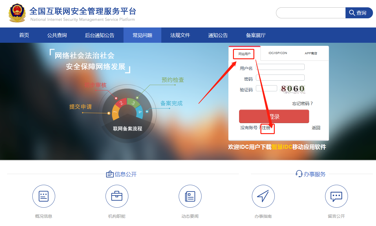登陸https://beian.mps.gov.cn注冊用戶名和密碼,一般企業(yè)網(wǎng)站選擇 > 網(wǎng)站用戶 > 注冊